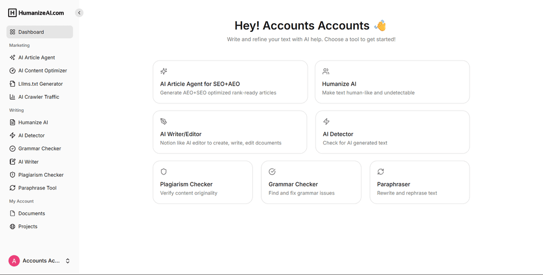 HumanizeAI transforms AI-generated text into natural, engaging writing while preserving your original ideas. This core technology powers our platform—from today’s AI Article Generator Agent to upcoming tools like Content Optimizer, AEO Traffic Tracker, and Site Audit. Every tool combines humanized writing with SEO and AEO optimization, so your content not only sounds authentic but also ranks on Google and surfaces in ChatGPT, Gemini, and voice assistants.