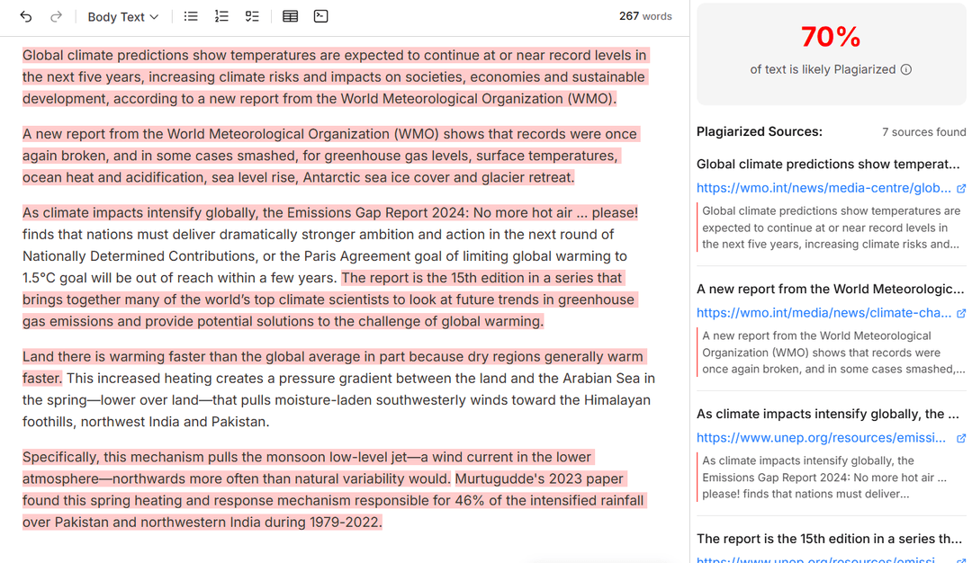 Highlighted Text: Plagiarized sections highlighted in red for easy identification